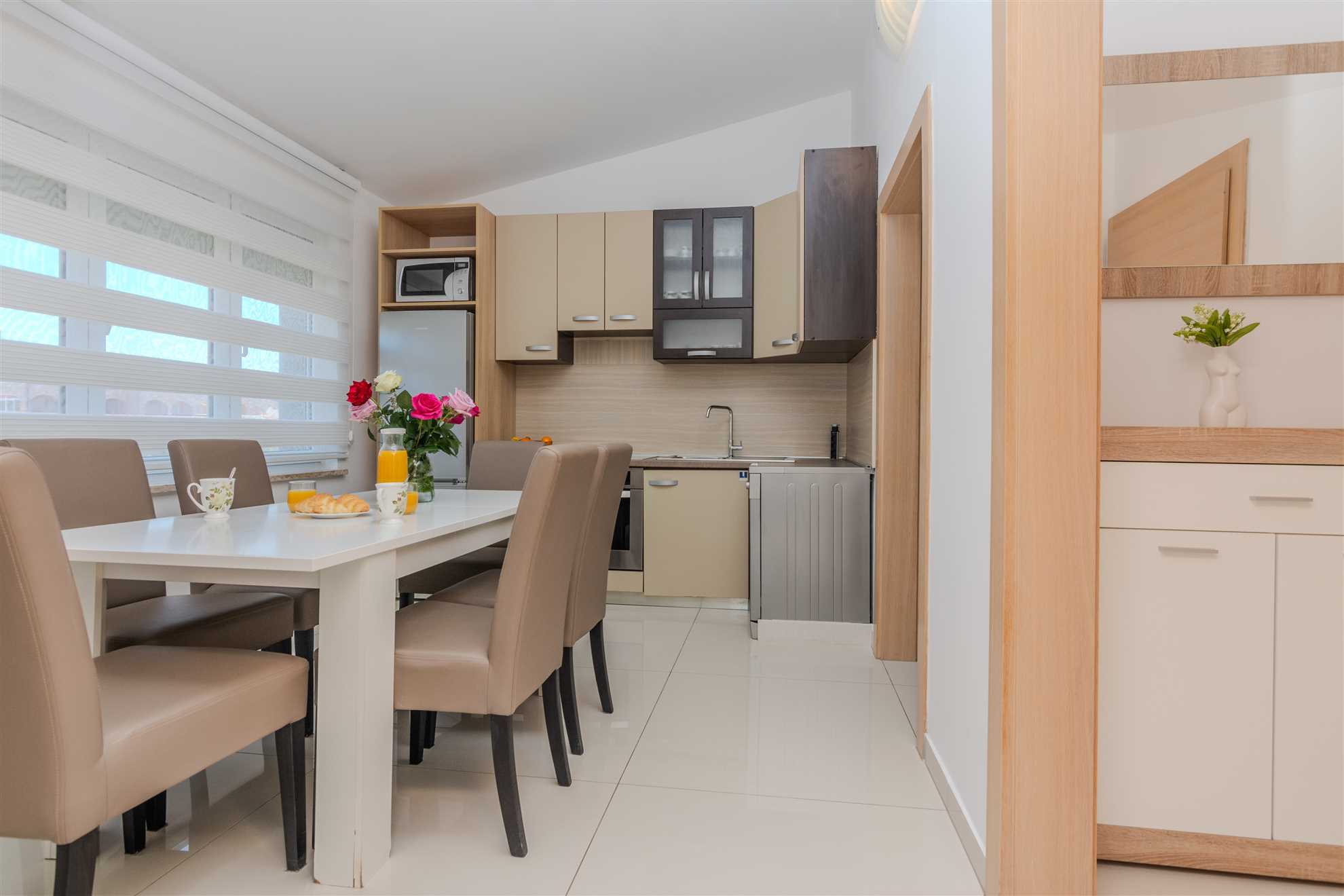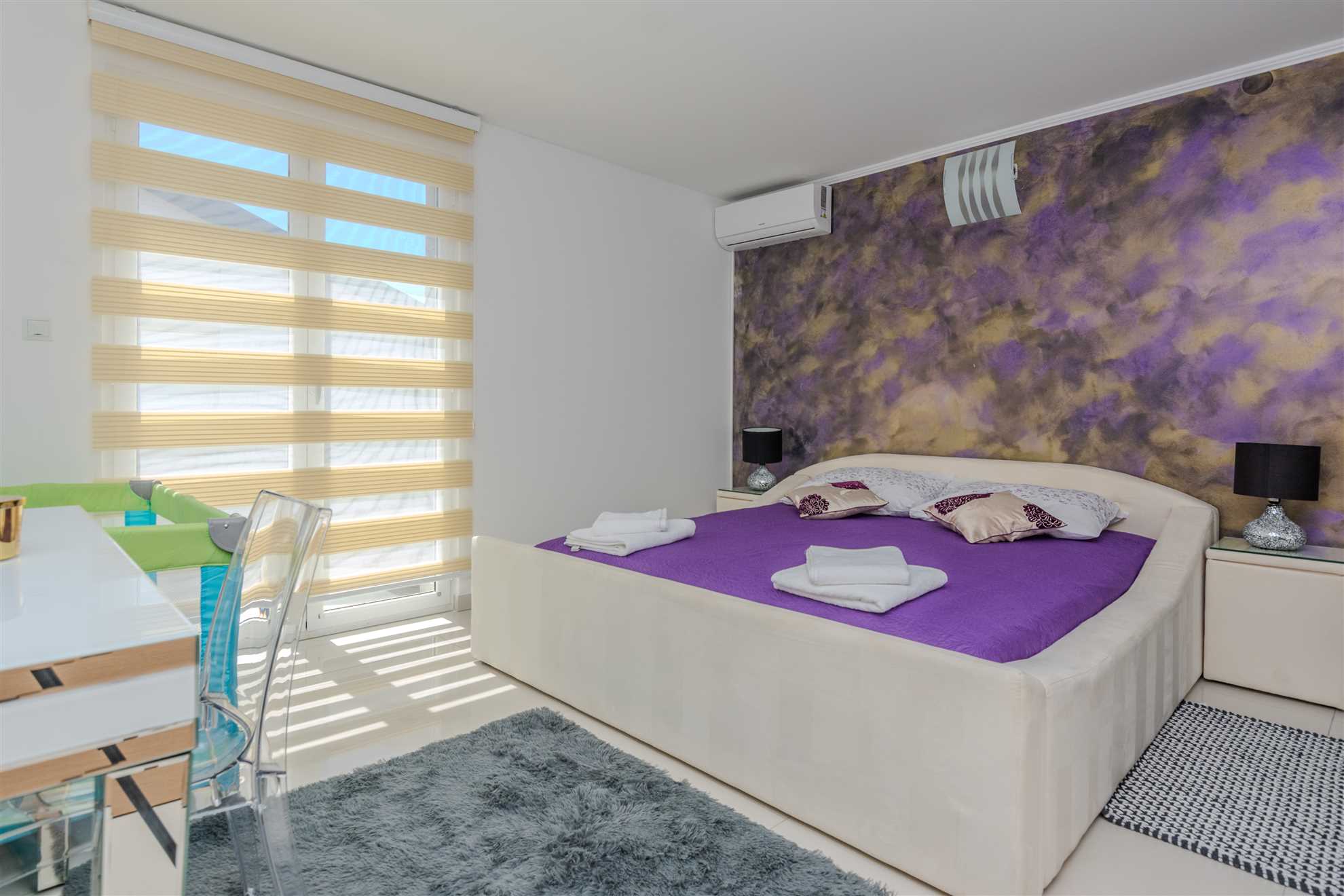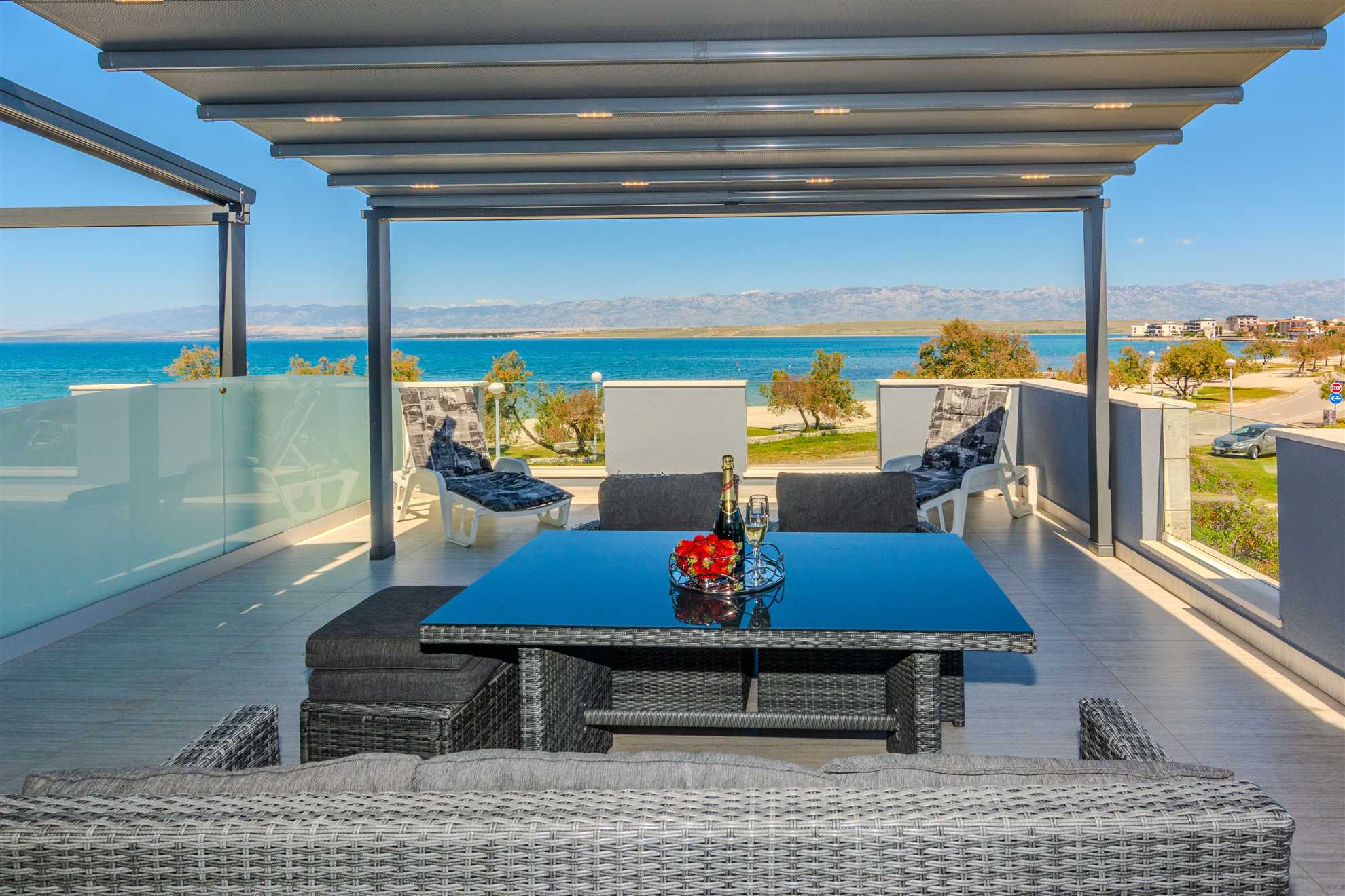 This apartment for 4-6 persons is located directly on the beach, in an area called Lučica on the island of Vir. Luxurious and modernly furnished 70m2 apartment on the first floor of the house is divided into a living room, dining room and well equipped kitchen, two bedrooms with double bed and a bathroom with shower and toilet. In the living room there is a sofa bed for two more persons. From the living room You can reach onto a spacious 40m2 balcony with a stunning sea view, equipped with table, chairs and sun lounger, where You can enjoy the sea view and fresh sea air. Air conditioning, satellite TV, Internet and parking on the property are also available and without surcharge. The nearest beach is just 20m from the house!