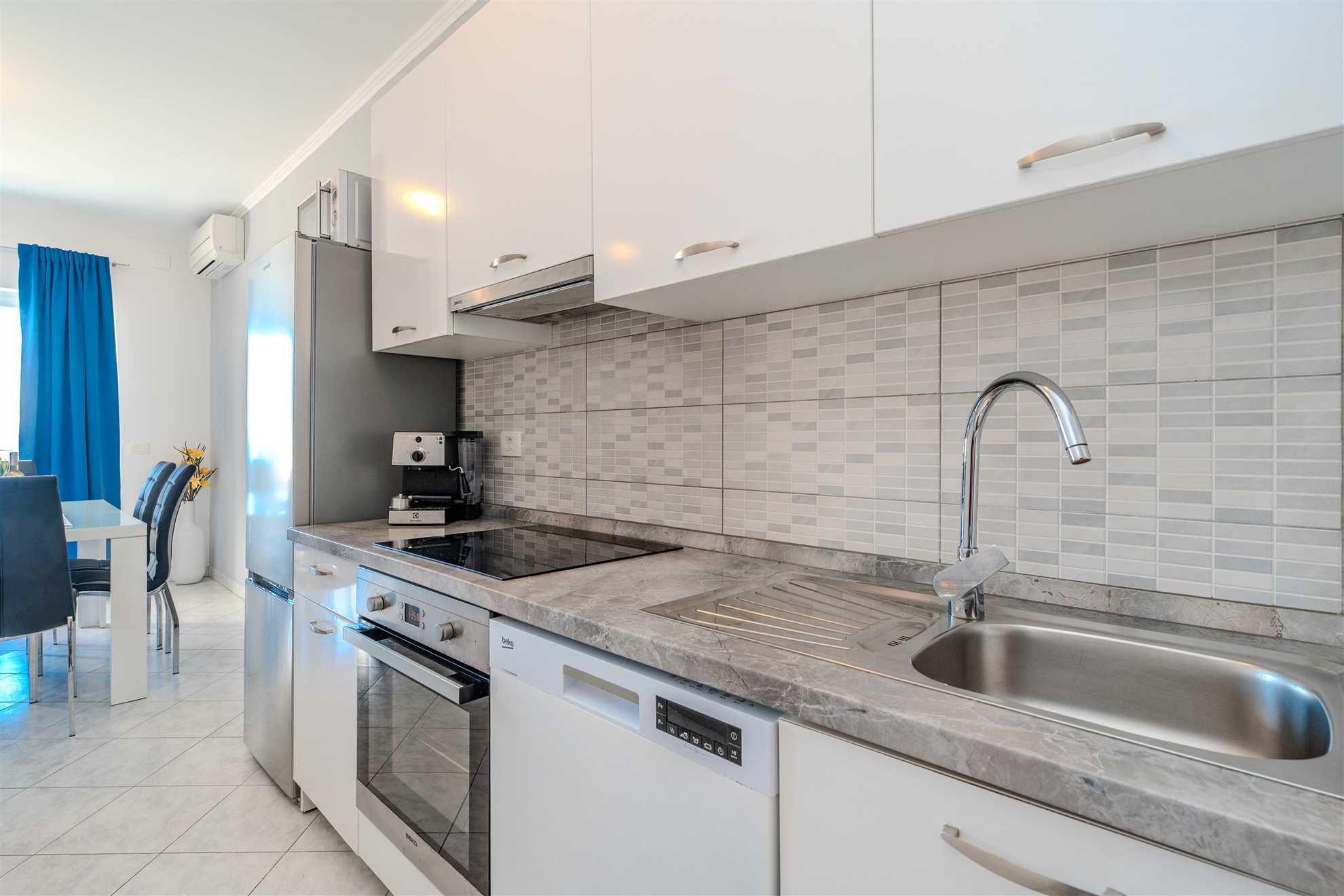Apartment (52 m²) is divided on a living room with a dining area, fully equipped kitchen, two bedrooms with double beds and a bathroom with a bathtub. In the living room there is a sofa bed for two persons. To the apartment belongs a roofed 12 m² terrace with a sea view furnished with loungers, table and chairs.