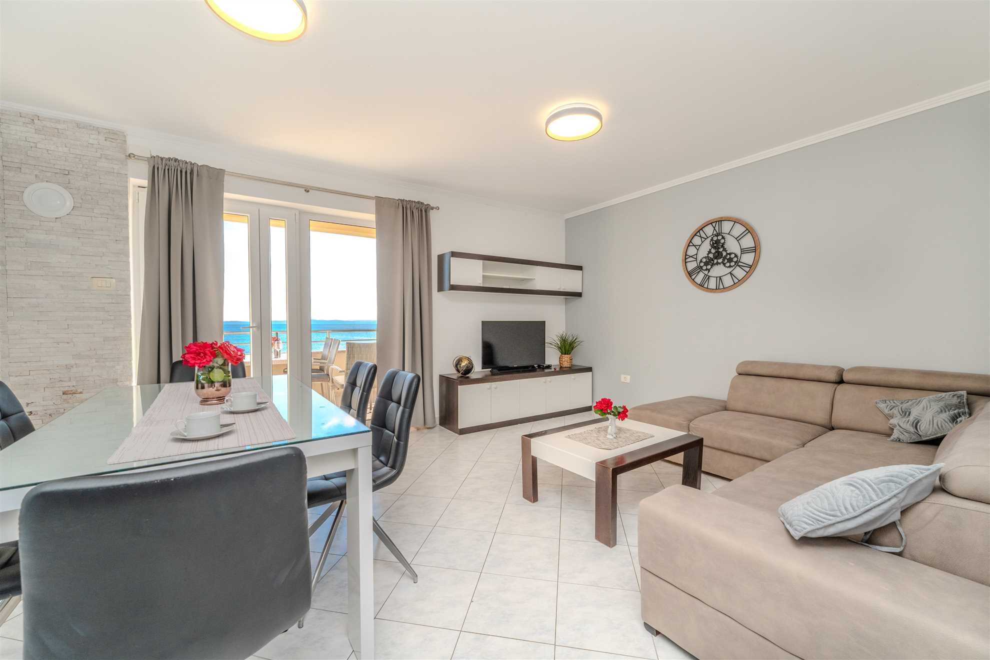 Apartment (52 m²) is divided on a living room with a dining area, fully equipped kitchen, two bedrooms with double beds and a bathroom with a bathtub. In the living room there is a sofa bed for two persons. To the apartment belongs a roofed 12 m² balcony with a sea view furnished with loungers, table and chairs.