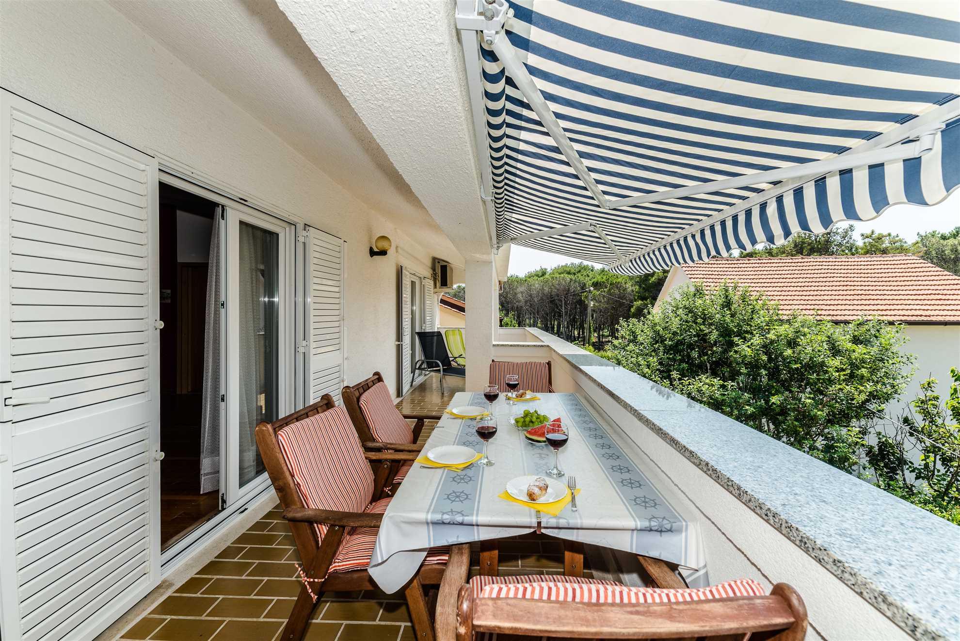 Apartment (70 m²) is divided on a living room with a dining area, fully equipped kitchen, two bedrooms with double beds, of which one is air-conditioned and two bathrooms with showers. To the apartment belongs a 22 m² roofed balcony with sea view, loungers, table and chairs. Courtyard (900 m²) of the property is equipped with barbecue, table and chairs.